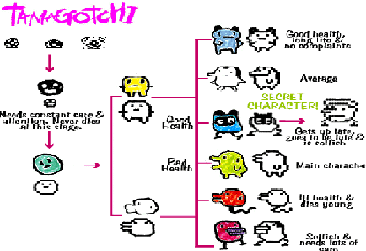 It is a dark time for the human race, we have been duped by a megalo-maniacal super corporation in Japan known as Bandai (Bum bum bauuuummmmm!). This huge empire has released a worthless little group of trinkets known as Tamagotchi (Ta maa goo chi). Which are plaguing the minds of our friends, our loved ones, our children! So I have decided to fight back!!! Now I know what you're thinking. "What a meanie, how can one man be so cruel?" But to tell you the truth, I don't care what you think, so clam up and pay attention! I've heard enough about these little devil spawns, so now it's open season. First are the facts. These little toys cost around twenty-five dollars - not exactly bargain basement. Then they are supposed to become "The perfect companion, fun for the whole family...". What do you get instead? A stupid chunk of plastic that beeps and develops absolutely no personality. Come on, my bathtub has more depth then this! What's even worse, they come equipped with a small alarm so when they wake up, you wake up. D'oh! This would not normally be so bad, if you don't mind getting up at 3:00 am. This problem is increased by the fact that not even Rip Van Winkle could sleep through the constant beeping that the little freaks make. For the love of God, it's worse than Rush Hour at Grand Central Station. It's always saying, feed me, play with me, love me, YEESH! I know this because my sister's best friend owns one, and its blasted alarm woke me up... and I sleep downstairs... with the door shut! Anyhoo, we move back to the point about the depth of this "revolutionary item". As I was saying, these virtual pets go about as deep as a hole made when one digs his pinky finger into the ground. There whole life revolves around this simple chart