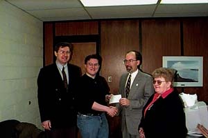 Tullamore Nursing Home officials recently presented a $1,000.00 cheque to Turner Fenton Secondary School in appreciation for a marketing video made for the home by three students. From left, Head of Turner's Communications Dept. Steve Russell, Ian Gadsby, one of the students who produced the video, accept the cheque from Tullamore administrator Geoffrey Doff, and Tullamore activity coordinator Jean Duffy. The video was scripted, story boarded and shot by the students. Music, titles and effects were then added by them in post-production to fit the "feel" of the nursing home, which now uses the video to show prospective residents and their families what the home is really like. Ian Gadsby, Richard Glidden and Kevin Laven were the three students involved in the creation of the tape. They are currently earning an OAC Drama credit for a special course in Television Production offered at Turner Fenton. This project took them approximately one hundred hours of hard work including client interviews, scripting, shooting and editing. They also used copyright free music and learned about editing using the new AVID Cinema software available on the Macintosh Performa 6400/200 Video Editing Edition.
