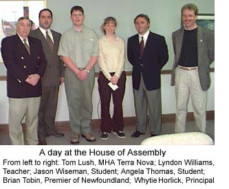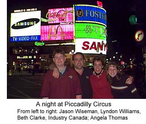 So began our journey. We went to the airport, where we were confronted by a very persistent, yet friendly, reporter from CBC Radio. She requested an interview which, upon permission, we gave her. First we flew to Toronto to change flights, and thirteen hours after our initial departure, we eventually arrived in the Heathrow Airport. It was 6:30 a.m. London time when we arrived -- that's 3:00 a.m. in Newfoundland. We took a forty-minute taxi ride out to our hotel, the Vanderbilt. Our hotel is really great and it is close to a lot of the tourist attractions. For the rest of the day, we did a lot of sight-seeing, which included a double decker bus tour. The bus did not have a roof on the top level so we could enjoy the weather, as well as the sights. We drove past many historical sites and learned a little history about them all. London is a very interesting and beautiful place. It was twenty four degrees outside so we decided to get off the bus and walk back to our hotel through Hyde Park. When we arrived at the hotel, we took a nap because (needless to say) we were tired! Later, we went out for supper. We traveled on the subway for the first time in our lives -- it was cool. We ended up going to the Hard Rock Cafe, something that we had always wanted to do. It was a lot of fun, we had a great time and, of course, we all bought t-shirts! By the time we got back to the hotel, it was 11 p.m. and we were tired so we went to bed. Saturday, May 9, 1998 Our day began at around 9 a.m. The weather was equally as great as yesterday. We met in the hotel lobby around 10 a.m and then we went on another bus tour. Along the way, we stopped at Hyde Park to watch "Speaker's Corner," which we had learned about from Mr. Lush. It is a place where people with strong beliefs gather to speak their mind and convert others into thinking their way. On Saturday morning, three people were there, speaking on the topics of God, religious activity and international politics. Sometimes, arguments arose between the crowd and the speaker. It was an amusing and mind-opening experience to see how others view the world and society. Then we continued on our bus tour, ending up outside Buckingham Palace. We walked to Canada House to see where we would be for the presentation on Wednesday and to talk a little about the day. Although we are still a little tired and have jet lag, we agree that London is an awesome place with much to do and see. We will continue to keep in touch with you as the week progresses. Sunday, May 10, 1998 It's been another great day in London! Since we last wrote you, a lot of really great things have happened. We spent all of Sunday afternoon at Canada House, seeing where we would be presenting on Wednesday and getting comfortable with our surroundings. We met a lot of people involved in the ceremonies, such as representatives from Bell Canada, and representatives from government offices. When we finished there, we went out for supper in Leicester Square. It's a really interesting place -- there were performers, dancers, lots of restaurants and a big crowd of people. We ended up going out to Planet Hollywood. There were a lot of really cool things there from actors, actresses and movies.